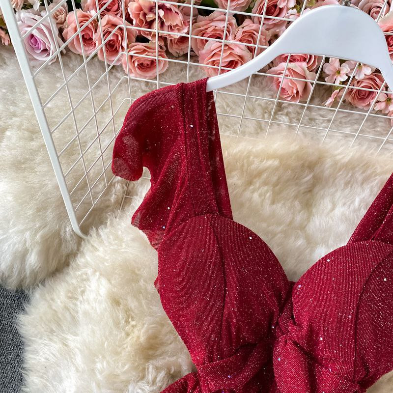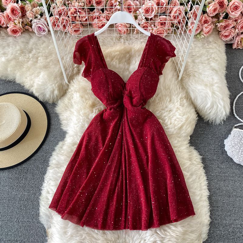 Petite robe noire d'été de style Hepburn rétro français taille sexy paillettes amincissantes coupe basse col en V robe trapèze manches courtes