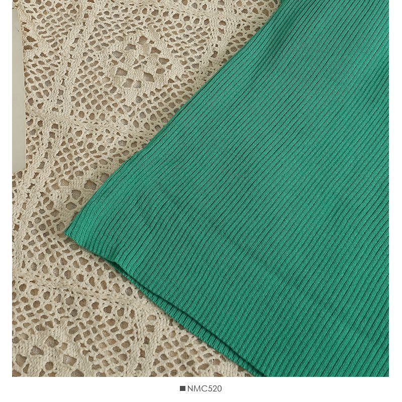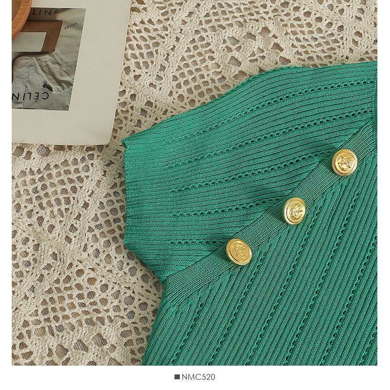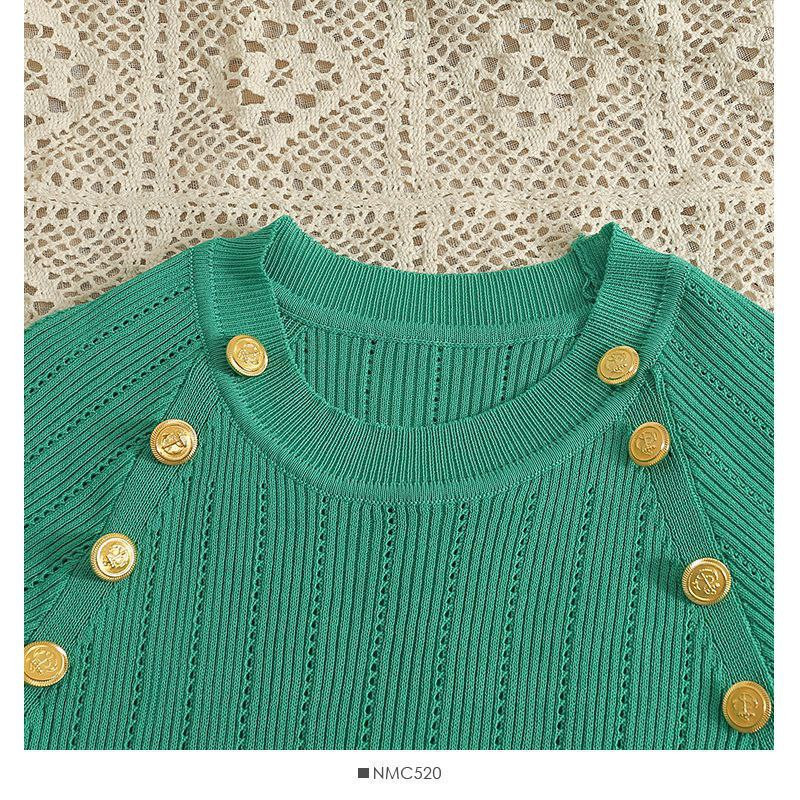 Couleur unie polyvalente version coréenne minceur col rond manches courtes bouton décoré jupe de hanche nouvelle robe tricotée pour femmes été