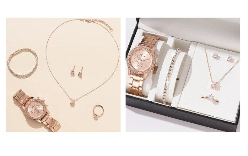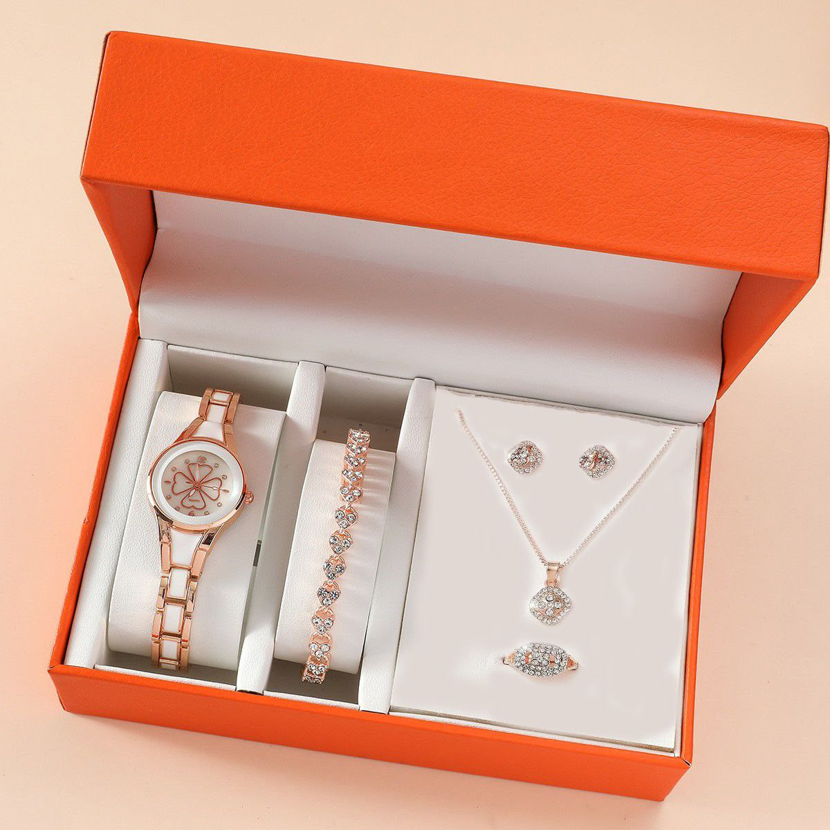 5 pièces/ensemble montre avec bracelet en acier faux trois yeux ensemble de montre à quartz coréenne décontractée pour femme (boîte orange)