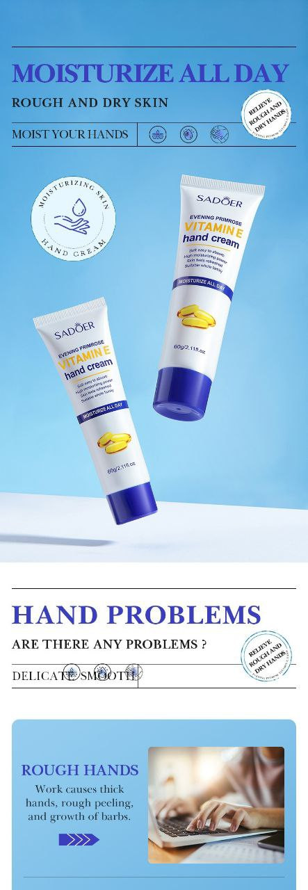 SADOER Crème pour les mains à la vitamine E à l'onagre Crème hydratante anti-fissure sèche pour les mains Crème pour les mains 60g