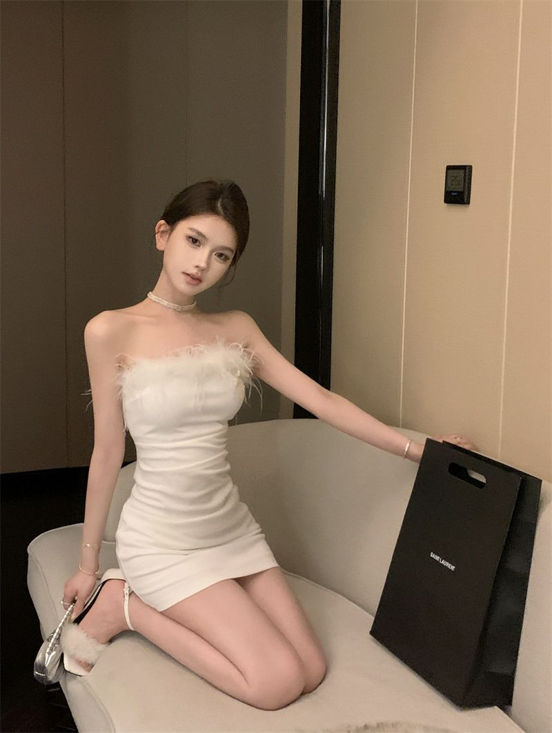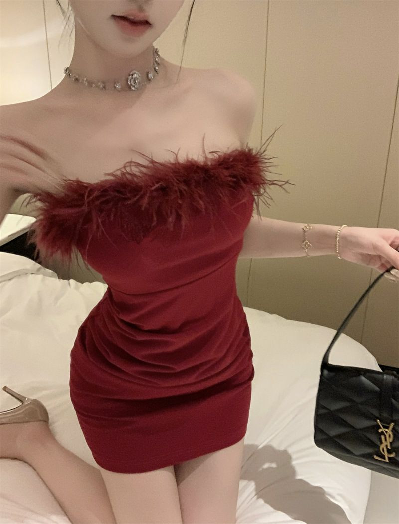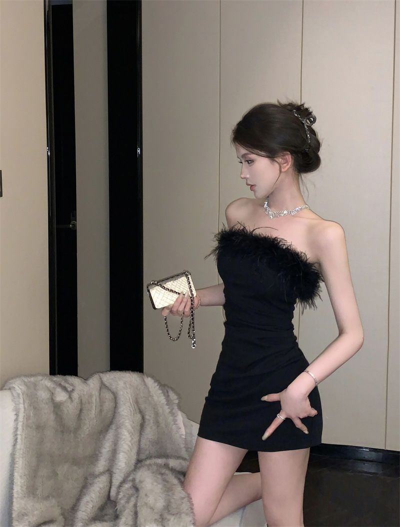 Robe courte sans bretelles pour femme - Taille froncée - Dos nu avec un col en fourrure à une seule ligne à la jupe de hanche mince sexy jupe robe pour femme