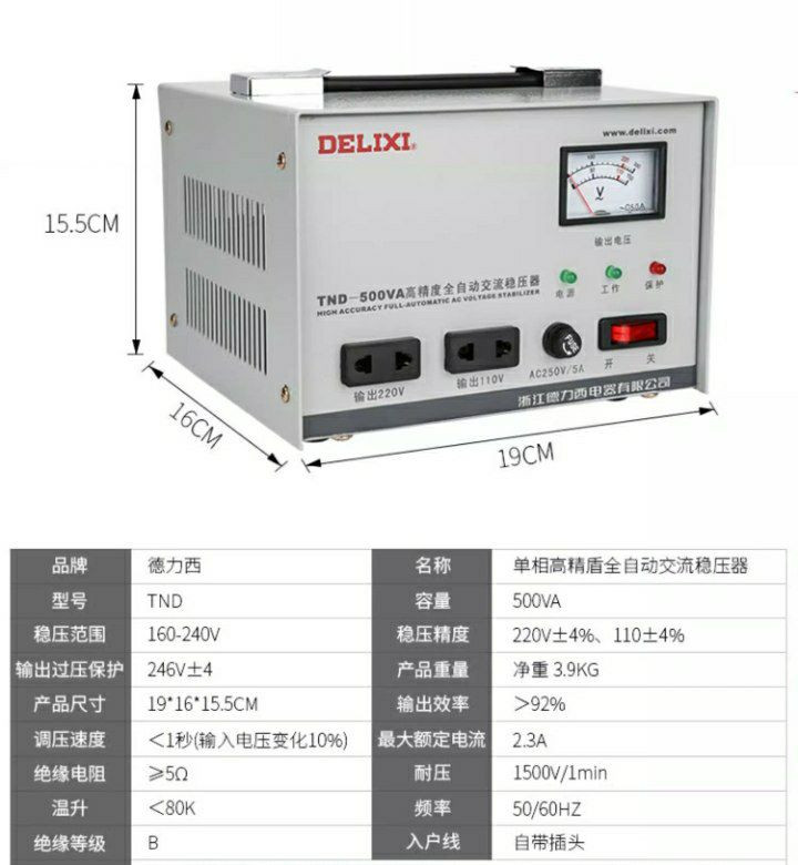 Un stabilisateur de tension CA entièrement automatique de haute précision Delixi TND-500VA. Régulateur de tension de l'ordinateur de marque: Delixi 220V entièrement automatique TND-500W Home ordinateur dédié TV Alide Alimentation