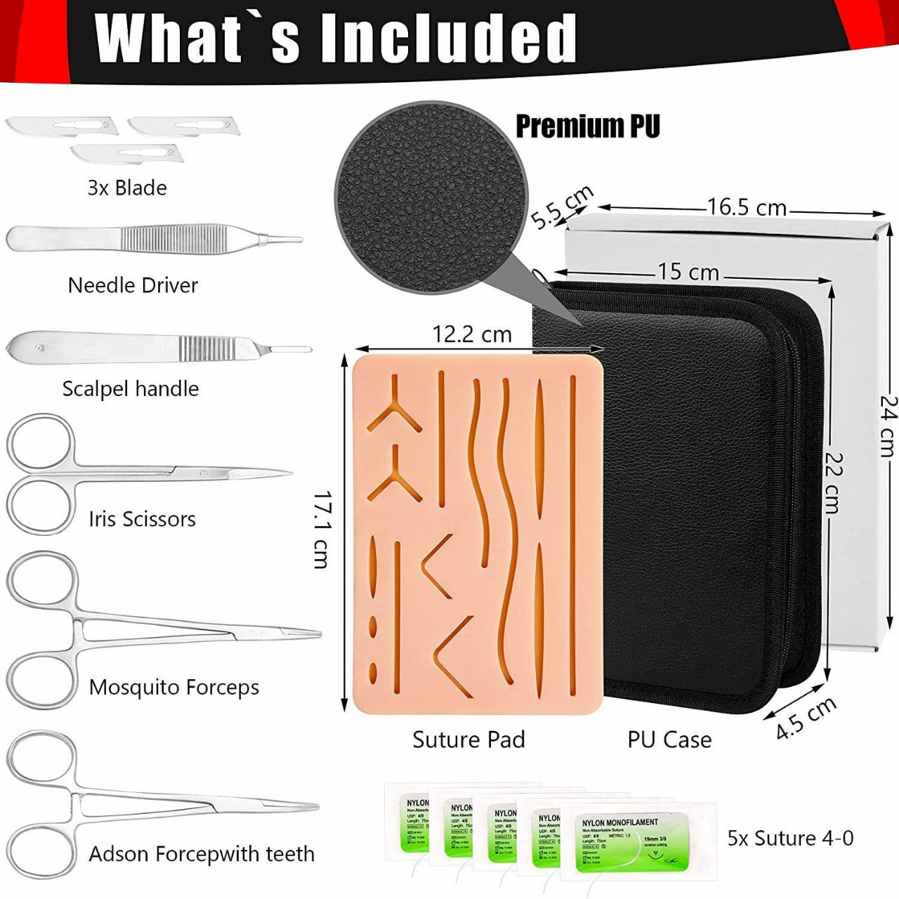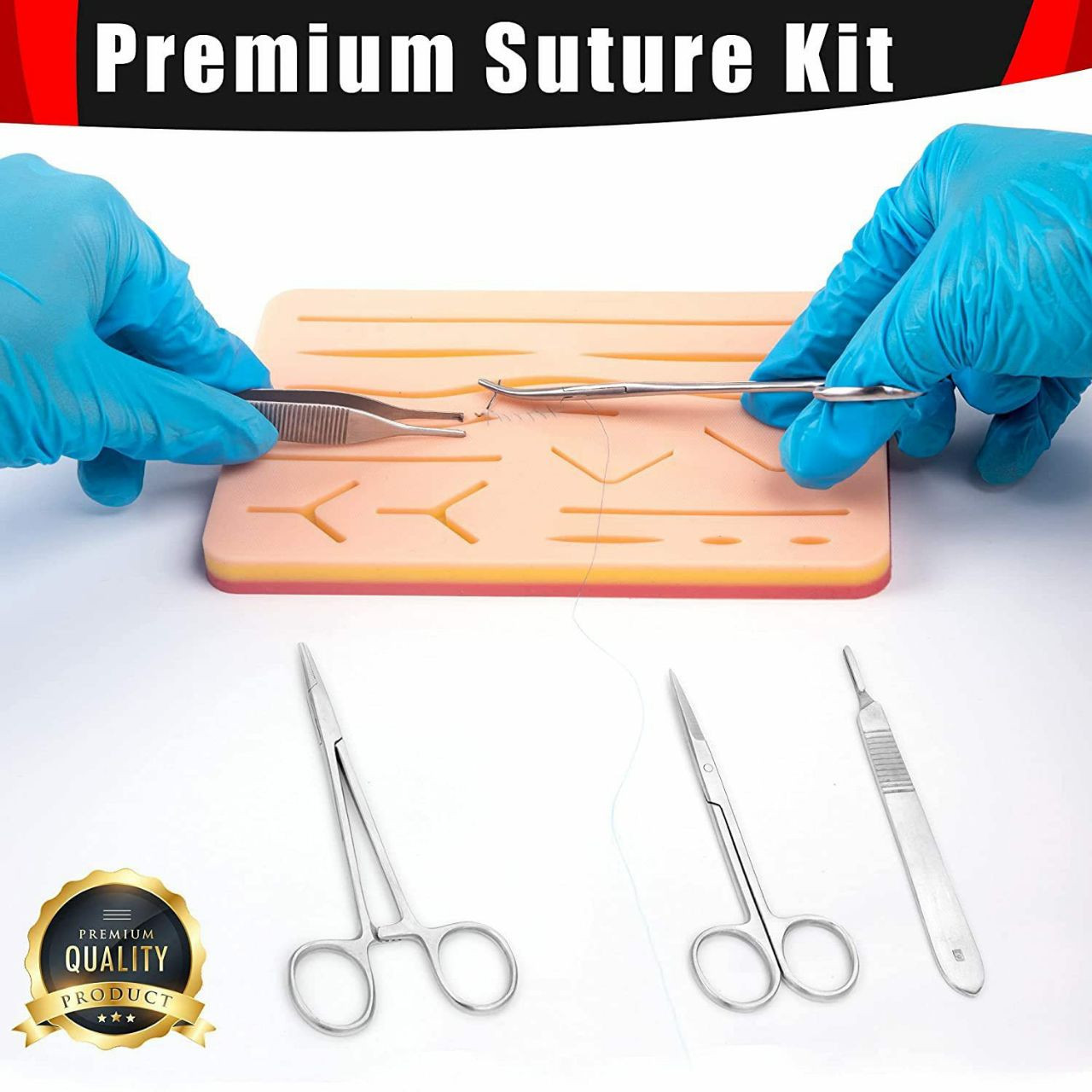 kit complet de pratique de suture pour l'entraînement à la suture comprenant un grand tampon de suture en silicone avec des plaies prédécoupées, 14 morceaux d'outils d'anatomie biologique, ciseaux d'aiguille en acier inoxydable, équipement expérimental, outils, sondes, ciseaux et pinceaux d'instruments d'enseignement