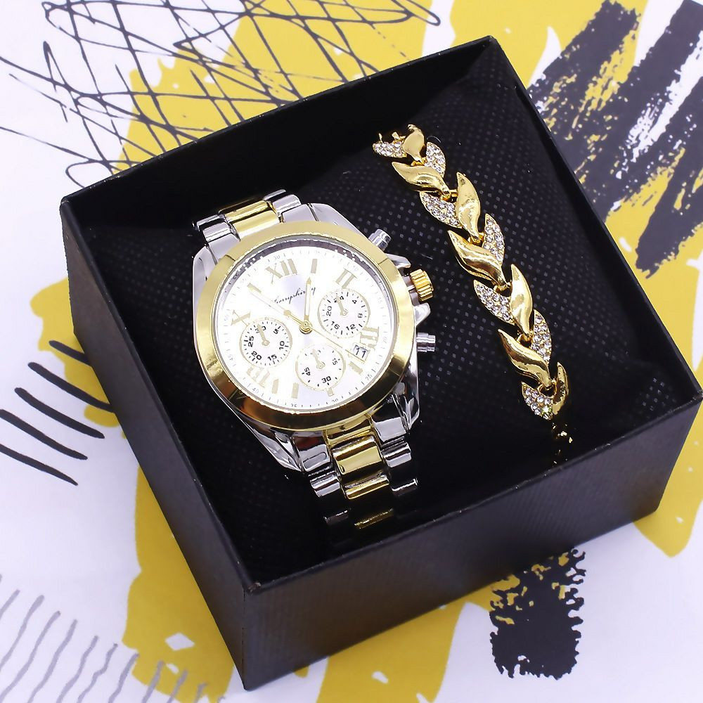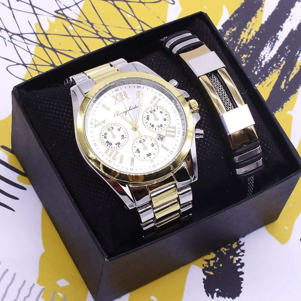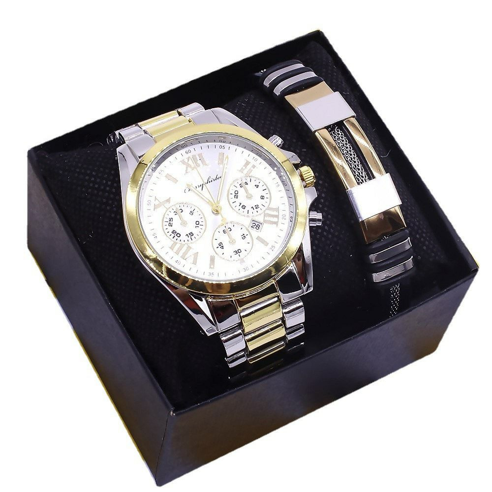 Montre-bracelet pour homme et femme de style militaire décontracté ou de luxe, avec un bracelet en acier inoxydable bicolore (argenté et doré) et un cadran blanc avec des sous-cadrans de chronographe.