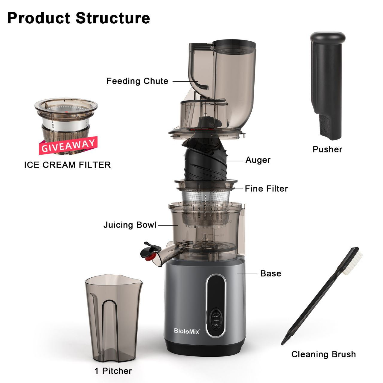 Accessoires : Inclut un filtre à glace gratuit, un contenant à jus, et un poussoir.