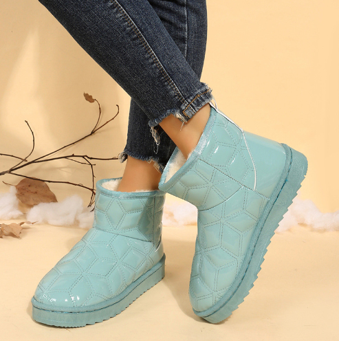 Bottes de neige pour femmes - couleur solide à carreaux, plus velours, bottes en coton à mi-mollet, fond souple, antidérapant, chaussures en coton noir pour femmes.